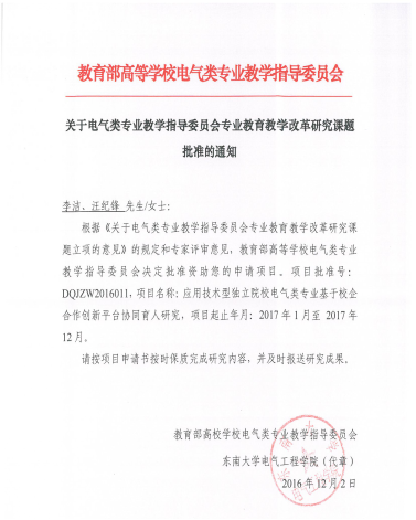 近日,教育部高等学校电气类专业教学指导委员会公布了2016年度专业教育教学改革研究课题。根据《关于电气类专业教学指导委员会专业教育教学改革研究课题立项的意见》的规定和全国电气领域专家评审,武汉大学、华中科技大学、西安交通大学、西北工业大学、重庆大学、湖南大学等知名高校的教改项目获批,其中全国范围内民办高校共有3项获批。重庆市仅有重庆大学和我校获批,我校自动化系汪纪锋教授和李洁主持的“应用技术型独立院校电气类专业基于校企合作创新创业平台协同育人研究”项目获得立项。