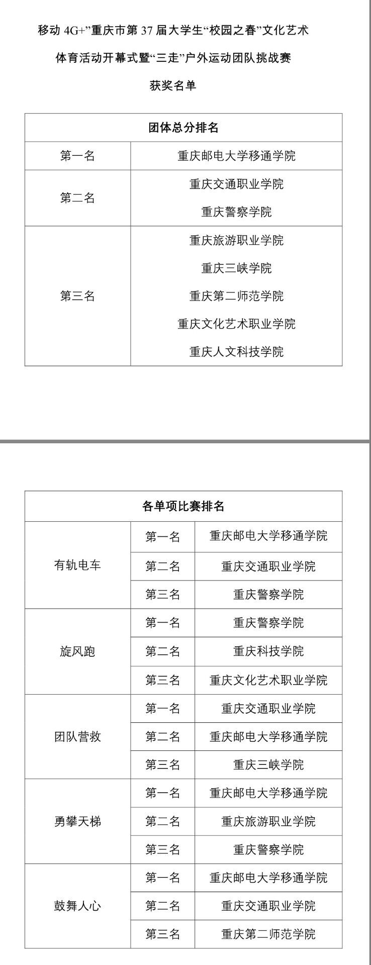 下午5点40分,最后一场比赛结束后,各高校在田径场集合整队,我校素质拓展训练部主任郭帅老师发表讲话,“本次‘三走’户外运动团队挑战赛历时一天,本着公平公正的原则顺利进行,圆满结束。现在我宣布,重庆市第37届大学生‘校园之春’文化艺术体育活动之‘三走’户外运动团队挑战赛圆满落幕!”郭帅老师代表评委组宣读成绩与名次,重庆邮电大学移通学院获得团体总分第一名,重庆交通职业学院、重庆警察学院并列团体总分第二名,重庆三峡学院等4所高校并列团体总分第三名;重庆邮电大学移通学院获得“有轨电车”“勇攀天梯”“鼓舞人心”三个单项第一名,重庆警察学院获得“旋风跑”第一名,重庆交通职业学院获得“团队营救”第一名。各学校代表队教练和运动员一一上台领奖。