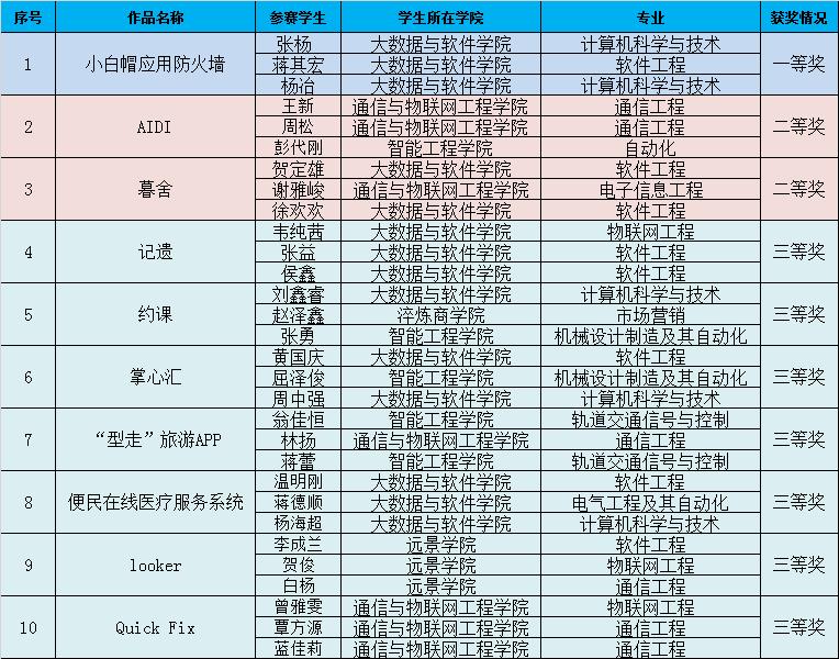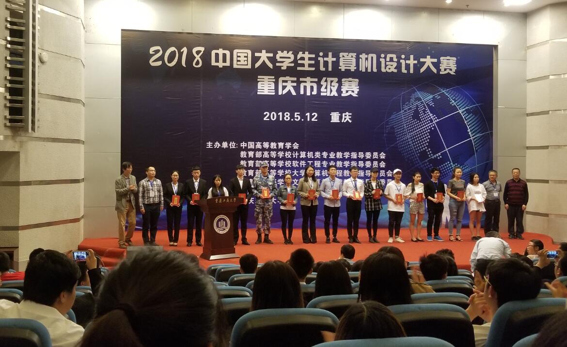 2018年5月12日,从重庆工商大学传来喜讯,双体学子在2018中国大学生计算机设计大赛重庆市级赛中发挥出色,斩获一等奖1项,二等奖2项,三等奖7项,自2014年组织学员参加该项赛事以来,持续保持着优异的赛事成绩。同时,一等奖作品《小白帽应用防火墙》,二等奖作品《暮舍》、《AIDI》将由市赛组委会推送到国赛平台,代表重庆赛区参加8月在上海东华大学举办的全国总决赛。