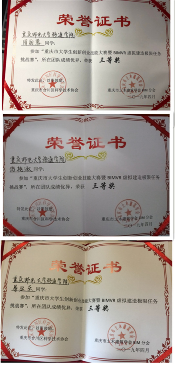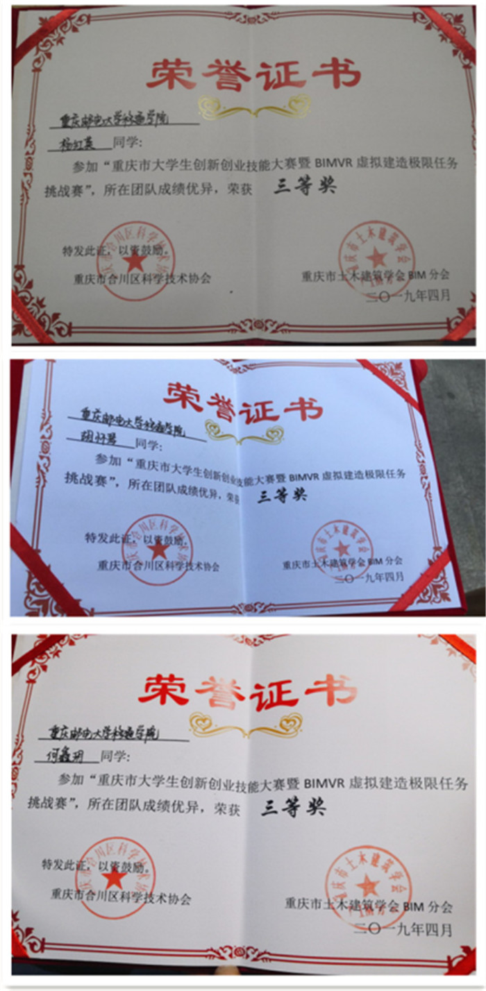4月20日至24日,在张红、李红艳、徐桂霄三位老师的指导下,管理工程系组建两支队伍代表移通学院,前往重庆工商职业学院参加重庆市大学生创新创业技能大赛暨BIMVR虚拟建造极限任务挑战赛。我校周丽蓉、游艳淑、易廷东、杨红英、胡怀琴、何鑫玥6位同学,经过四天的集训,斩获三等奖的好成绩。