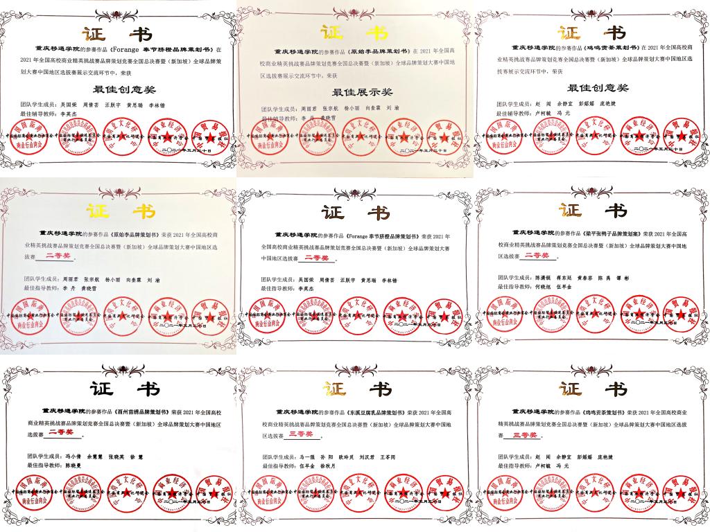 最终,由李英杰老师指导的“淡黄的橙子品牌策划工作室”,何晓旭、伍早金老师指导的“梁平张鸭子品牌策划工作室”,陈晓曼老师指导的“酉州苗绣品牌策划工作室”,李丹、龚晓雪老师指导的“青蓝品牌管理与战略研究工作室”荣获二等奖;由卢柯毓、冯元老师指导的“合光共争品牌策划工作室”,伍早金、徐秋月老师指导的“东溪豆腐乳品牌策划工作室”荣获三等奖;其中,《奉节脐橙品牌策划》、《城口县鸡鸣茶业品牌策划》荣获最佳创意奖,《原始李品牌策划书》荣获最佳展示奖。