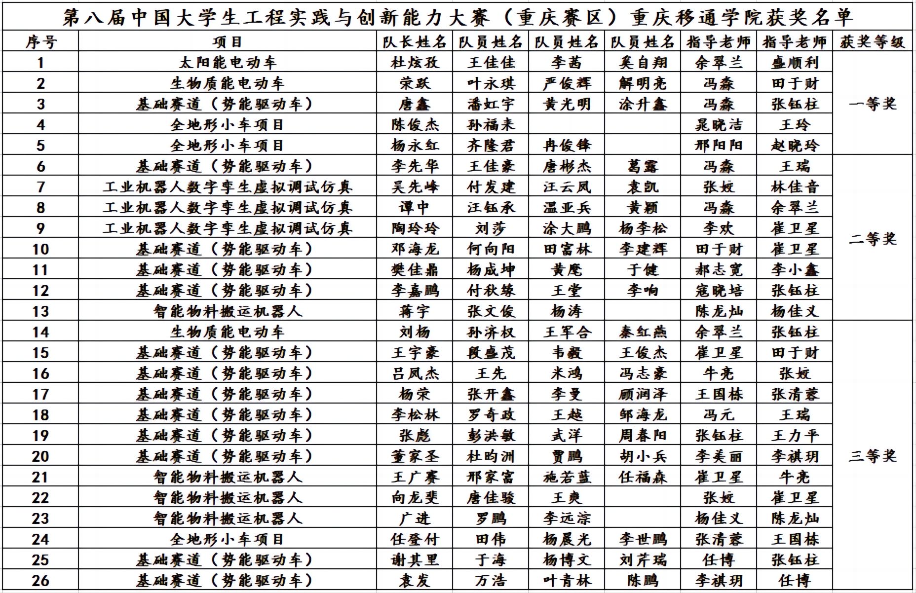 4月14至16日,第八届中国大学生工程训练综合能力竞赛(重庆赛区)在重庆科技学院工程训练中心顺利举行,智能工程学院选派了21支队参加3个赛道的6个赛项。同时,为了促进学院之间专业交叉融合,智能工程学院与德国工程学院教师联合指导了德国工程学院5支参赛队。经过与来自全市24所高校的近800名选手展开激烈角逐,智能工程学院代表队拟获得一等奖5项,二等奖7项,三等奖9项;德国工程学院代表队拟获得二等奖1项,三等奖4项的优异成绩。更为可喜的是,太阳能电动车赛项获得重庆市第一名,生物质能电动车赛项获得重庆市第二名,全地形小车赛项包揽重庆市第一名、第二名的佳绩,实现了工程基础赛道参赛项目重庆市第一名“零”的突破。另外,在此次比赛中,我校与重庆大学是仅有的2所同时在两个赛项中取得第一名的高校。