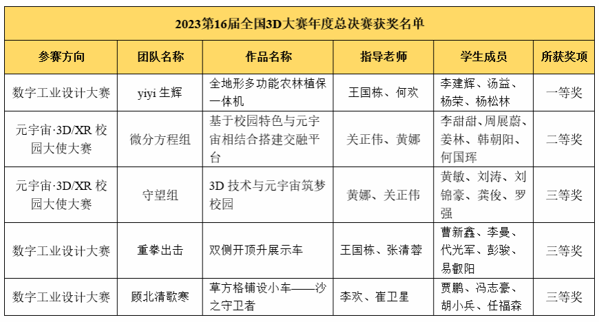 全国三维数字化创新设计大赛是全国普通高校大学生A类竞赛,是当前全国规模最大、规格最高、水平最强影响最广的全国大型公益品牌赛事。我校智能工程学院共5支队伍通过前期省赛选拔进入本次国赛。我校代表队与来自全国31个省/直辖市/自治区赛区800余所高校的20000余支团队进行激烈角逐,经过组委会综合评审,12月7日发布最终获奖几nei名单,我校代表队荣获国家级一等奖1项、二等奖1项,三等奖3项。