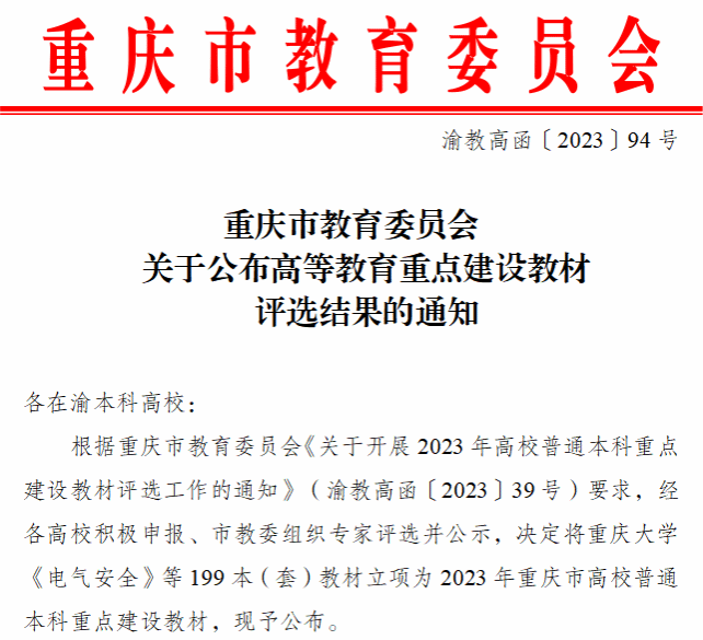 教材建设是育人育才的重要依托,是高等教育内涵式发展的重要抓手。近年来,学校不断加强教材建设力度,修订了《教材工作委员会章程》《教材建设管理办法》《教材选用管理办法》,鼓励教师积极参与教材建设与研究,不断提高我校教材建设质量。此次入选重庆市重点建设教材是对我校教材建设的充分肯定。