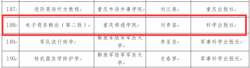 近日,重庆市教育委员会公布了《关于公布高等教育重点建设教材评选结果的通知》(渝教高函〔2023〕94号),我校《电子商务概论(第二版)》教材入选重庆市高校普通本科重点建设教材,这是我校继2020年《光纤通信系统与网络》教材获得首届市级高等教育优秀(规划)教材后的又一次市级重点教材新突破。