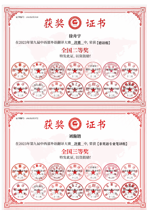 决赛中获得全国二等奖徐舟宇同学也分享了参赛心得:“这次比赛不仅是一次考验,更是一次锻炼和成长的机会。通过参加比赛,我不仅提高了自己的德语水平和翻译能力,还培养了自己的团队合作精神和应变能力。我相信,这些经历将对我的未来学习和工作产生积极的影响,我会继续努力,不断提高自己,为实现自己的梦想而努力奋斗。”