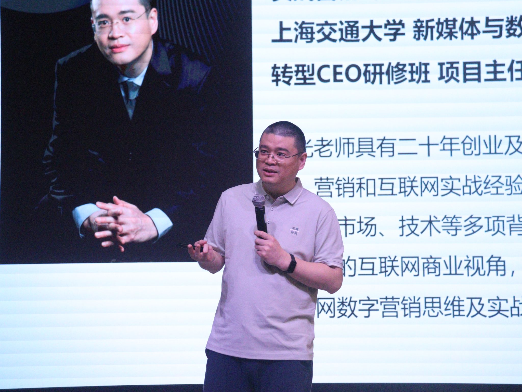 上午9点10分,资深数字化营销专家、上海交通大学新媒体与数字化转型CEO研修班项目主任袁凯老师(互联网花名:极光)以“全域流量与品牌创新”为主题,为现场的老师们带来了一场绘声绘色的授课,掀起了本次培训的第一波高潮。