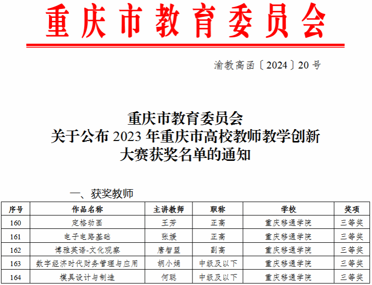 近日,重庆市教育委员会公布了重庆市2023年教师教学创新大赛获奖名单,我校推荐参赛的5个团队均获得重庆市三等奖,再次实现了全员获奖,在此项大赛中我校已连续两年实现100%获奖率,获奖数量位居重庆市同类院校榜首。