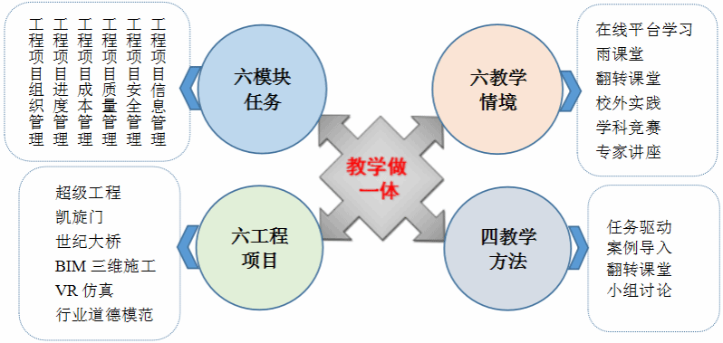 《工程项目管理》创建了“6664教学做一体”(六模块任务、六工程项目、六教学情境、四教学方法)的应用能力培养新教学模式。坚持立德树人,以学生发展为中心,能力培养为核心,思政与课程内容紧密融合,注重学生的个性发展、应用能力的培养,实现了知识、能力和素质的融合。