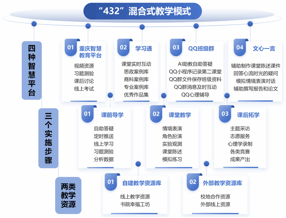 《幸福课》针对传统教学模式中学生参与度低、理论与实践脱节等问题,通过“432”混合式教学模式,依托四种智慧平台,通过课前导学、课堂教学、课后拓学三个步骤,结合两类教学资源,实现教学全过程的互动和活动。最终形成信息技术促成长、工坊活动促应用、专业融合促学习、体验实践促幸福的四大特色。师生通过课堂内外、线上线下的互动,在一定程度上有效提升了学生、教师和社会层面的幸福感,并取得了显著的教学成果,示范效应良好。