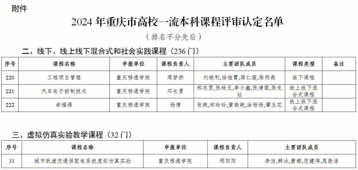 近日,重庆市教委公布了2024年一流本科课程的认定结果,我校虚拟仿真实验教学课程《城市轨道交通供配电系统虚拟仿真实验》获认定,市级虚拟仿真实验教学课程实现零突破。另1门线下课程、2门线上线下混合式课程获认定。截止目前,我校获认定市级一流课程共31门,其中线上一流课程12门,线下一流课程12门,线上线下混合式一流课程6门,虚拟仿真实验教学课程1门。