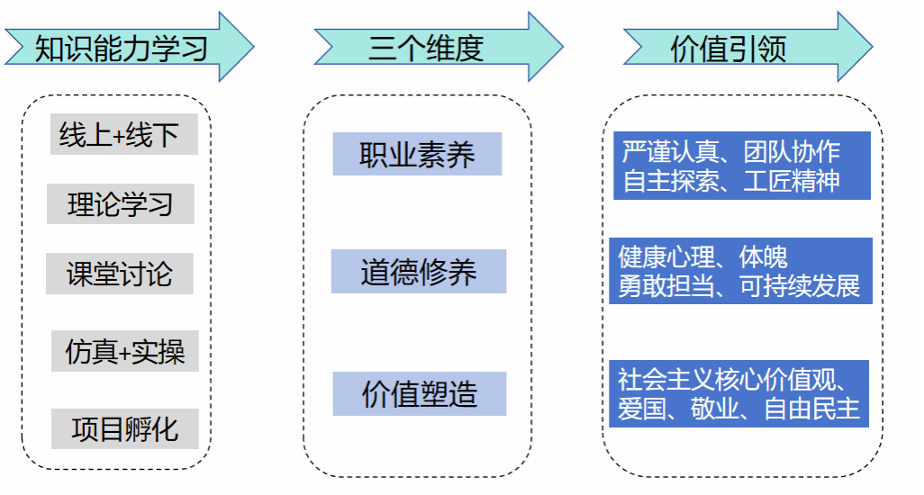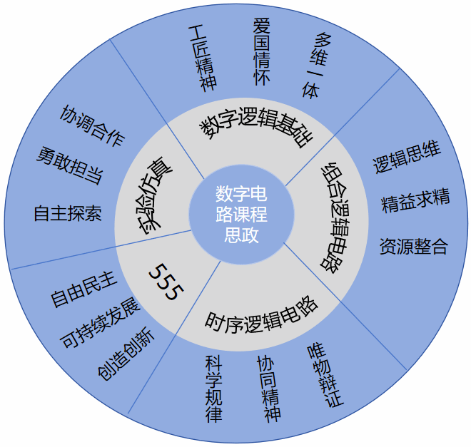 《数字电路与逻辑设计》课程作为电子类专业核心基础课程,始终坚持立德树人,以学生发展为中心,注重能力培养与思政教育的深度融合。课程通过“线上+线下”混合式教学模式,实现“全程、全员、全方位”三全育人目标,不仅传授专业知识,更在潜移默化中融入思政元素,培养学生的职业素养、道德修养和正确价值观。课程构建了“三维一体”教学方法,并将其融入到课程教学中。通过理论学习、课堂讨论、实操、仿真、项目孵化等多元化教学环节,实现了知识传授、技能提升和价值引领的统一。