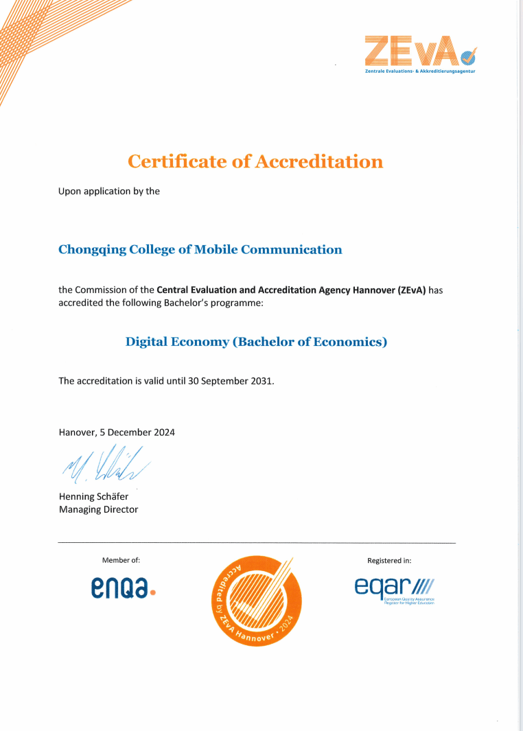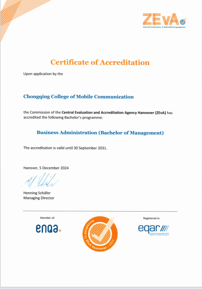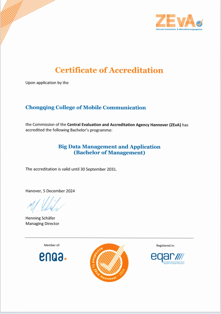 近日,重庆移通学院在国际教育领域迎来重大喜讯:大数据管理与应用、数字经济、工商管理3个专业成功通过德国ZEvA专业认证。学校成为国内应用技术大学领域中率先获得此项殊荣的院校之一,标志着教育质量和国际化办学水平得到国际权威认可。学校在教育国际化进程中迈出了具有里程碑意义的坚实步伐。