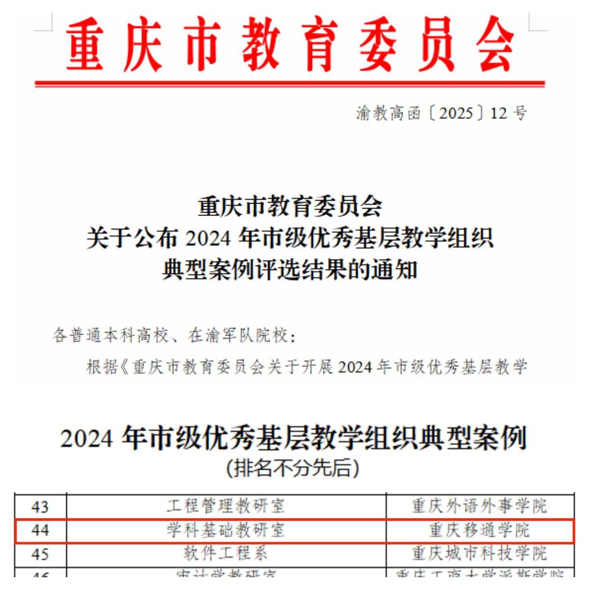 此次获评优秀基层教学组织典型案例,是对学科基础教研室多年来教学改革与创新实践的高度认可。未来,教研室将继续发挥示范引领作用,进一步深化教育教学改革,提升教学质量,为学校高质量发展贡献力量。