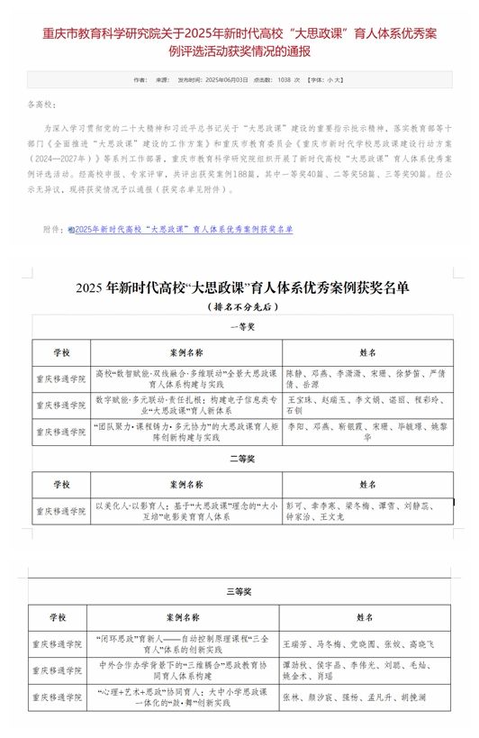 近日,重庆市教育科学研究院公布了2025年新时代高校“大思政课”育人体系优秀案例评选结果。我校在此次评选中表现优异,共7篇案例获奖,其中一等奖3篇、二等奖1篇,三等奖3篇,充分展现了学校在思政教育领域的创新实践与育人成果。