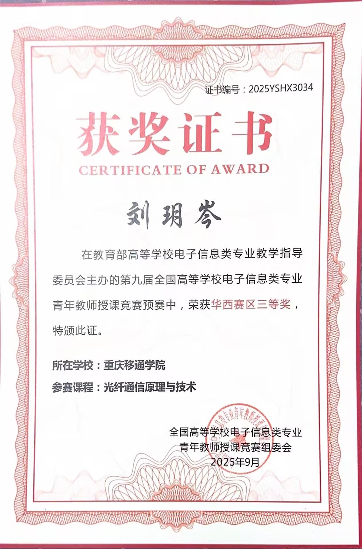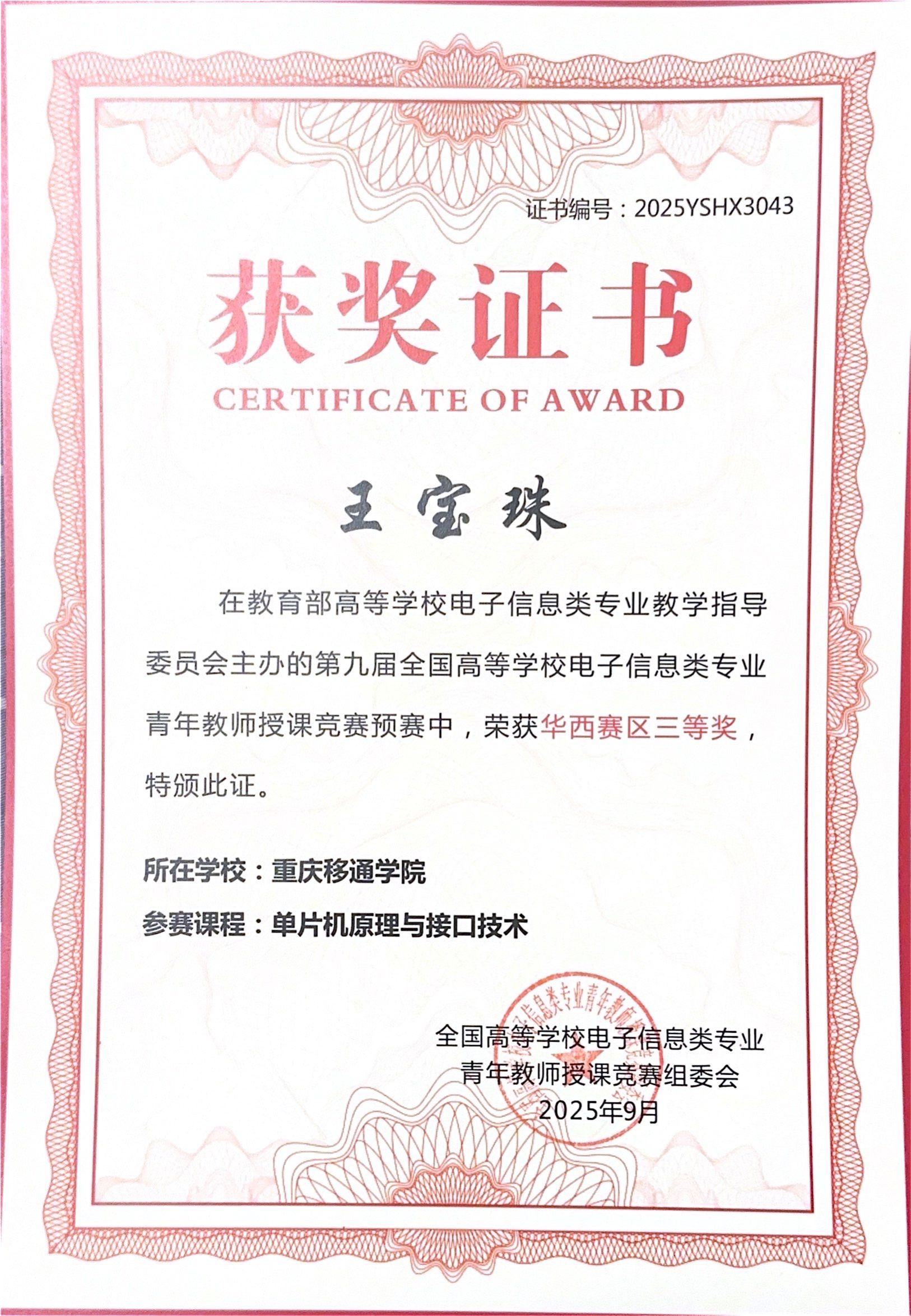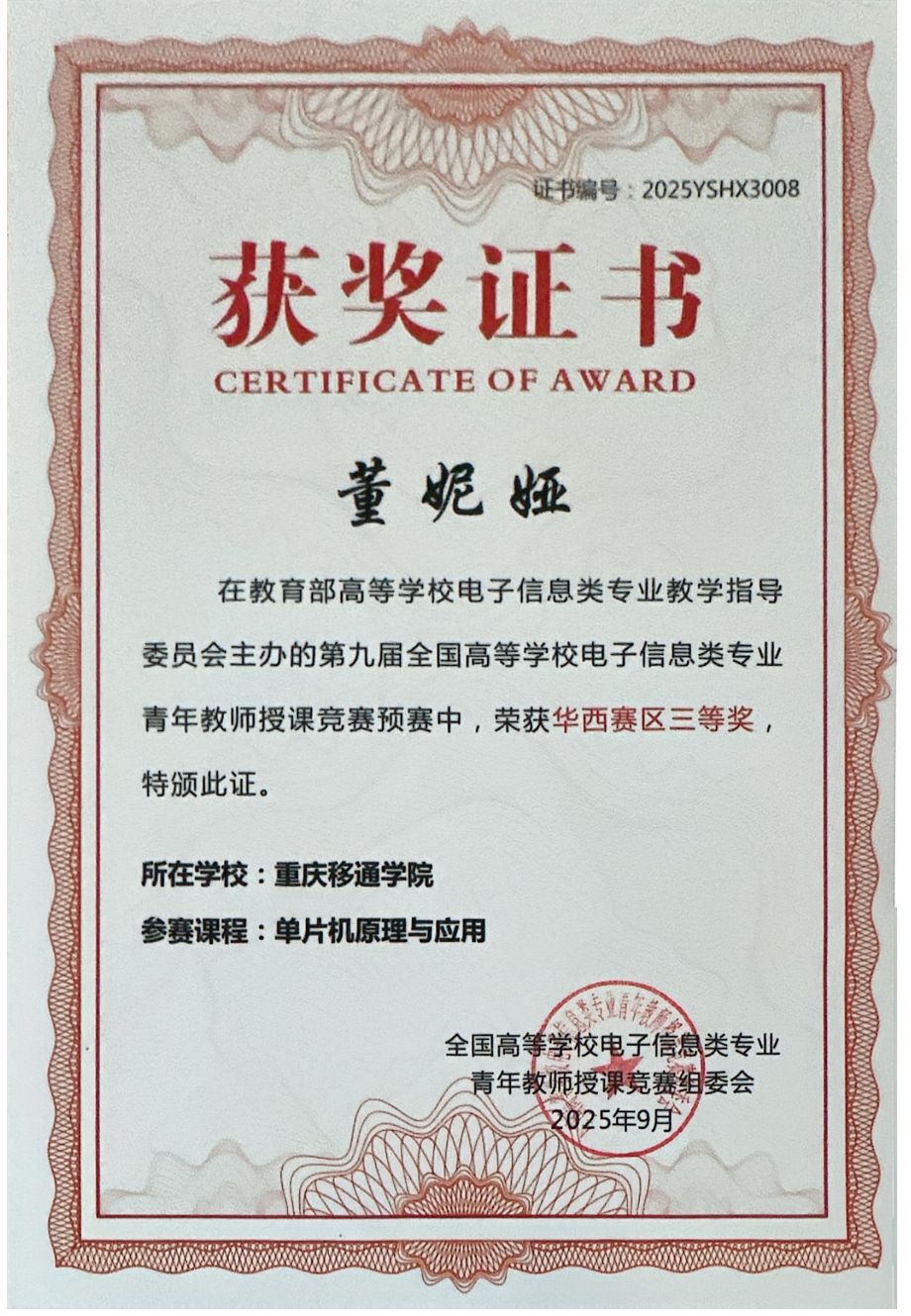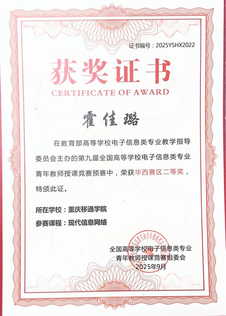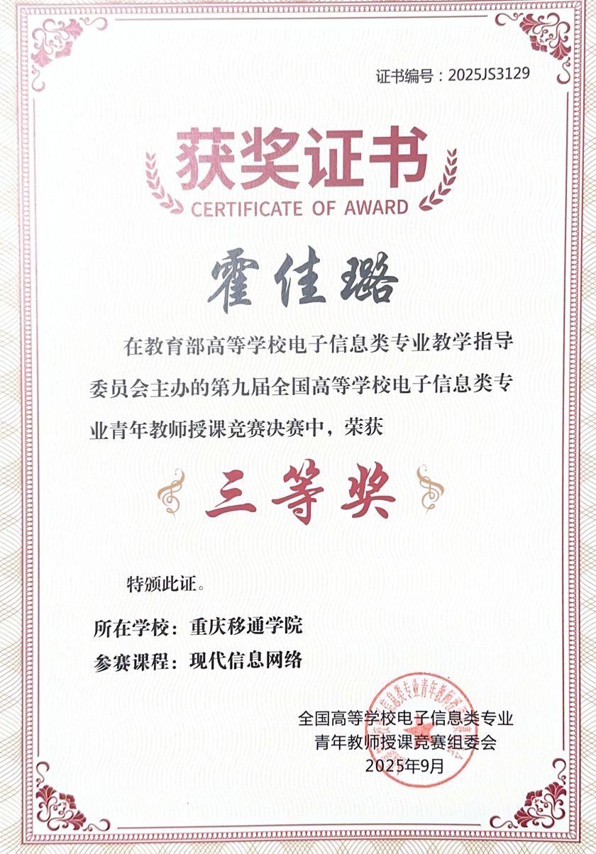本届竞赛以强化电子信息类专业青年教师的教学基本功与能力培育为核心目标,致力于通过竞赛机制驱动教学改革、提升育人质量并激发创新活力。赛事受到全国各本科高校的广泛关注,众多青年教师积极参与,角逐激烈。历经多轮严格评审,我校四位教师在各阶段表现卓越,最终斩获佳绩:其中,霍佳璐老师荣获华西赛区二等奖,并继而荣获全国总决赛三等奖;董妮娅、刘玥岑、王宝珠三位老师则均获华西赛区三等奖。