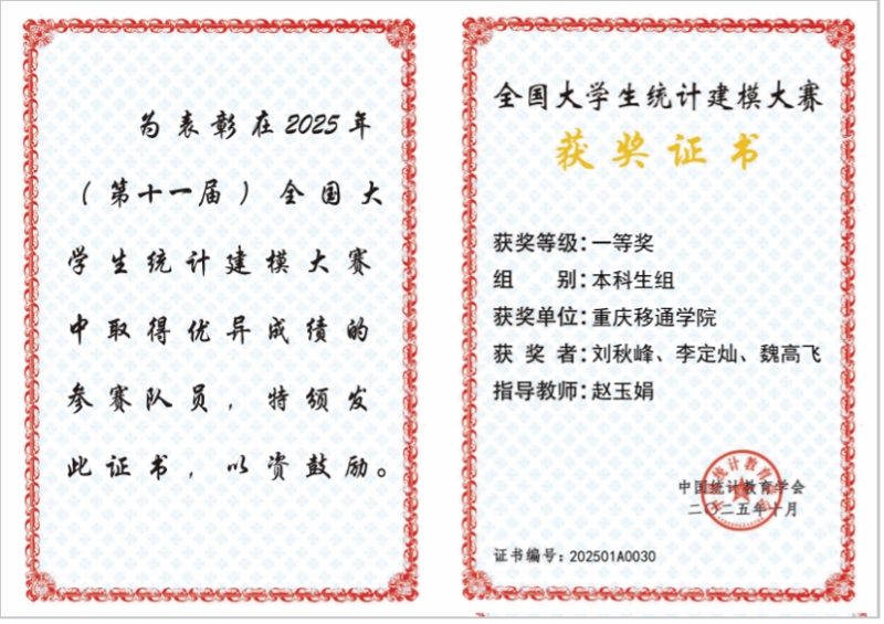 本届大赛自今年2月开赛以来,共吸引全国885所高校30941支队伍,92823名大学生报名参赛。经过校赛与省赛的逐级选拔,891支队伍成功入围全国总决赛。经通讯评审和会议评审,最终确定152支队伍晋级参与东北财经大学举办的国赛现场答辩赛。本届统计建模大赛中,学校成功斩获国家级一等奖1项、省部级一等奖3项、二等奖4项、三等奖6项,创下学校在该赛事获奖数量新高,同时,在重庆市同类院校中,学校的获奖数量位居首位。