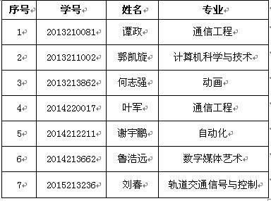 根据《重庆邮电大学移通学院学籍管理规定》(移通院〔2017〕81号)第九章第四十一条 “未经批准连续两周未参加学校规定的教学活动的”、“超过学校规定期限未注册而又未履行暂缓注册手续的”等规定,现拟对谭政等7名学生作退学处理。
