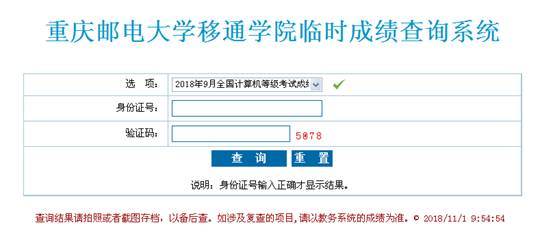 2018年9月15-16日全国计算机等级考试(NCRE)成绩已经公布,报名时选择考点为“重庆邮电大学移通学院”的考生,可以登录官方地址:http://222.179.134.225:81/cjcx/index.asp查询,如下图所示: