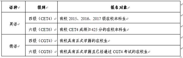 2.学生在报名时,笔试只能报名一个语种和级别,即英语四级、英语六级,只可二选一。若未按要求报名,将被取消考试资格。