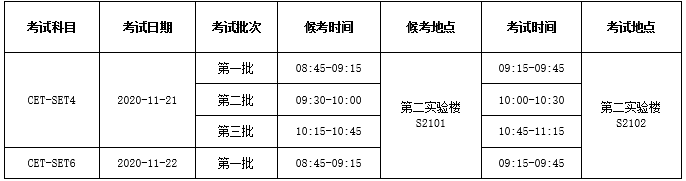 我校将于2020年11月21-22日举行全国大学英语四六级口语考试(CET-SET4、CET-SET6)。现将考试安排和考前模拟测试等相关事宜通知如下。