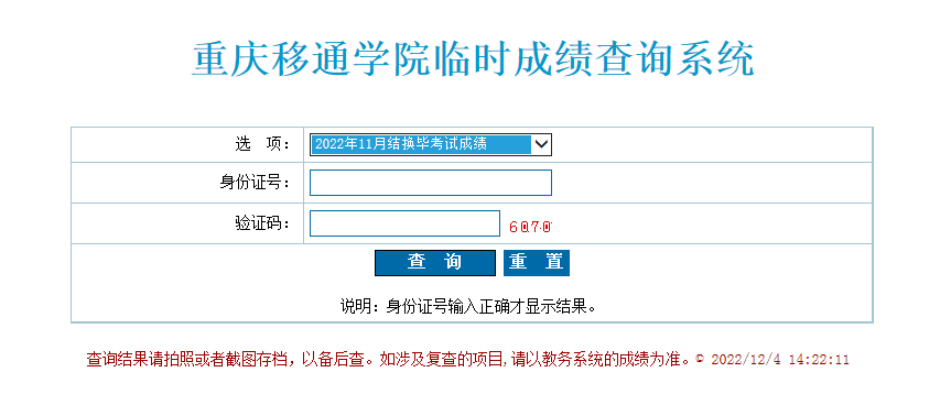 在“选项”中按需选择“2022年11月结换毕考试成绩”、“2022年11月学位水平考试成绩”,输入身份证号码(最后一位为“X”的需大写)和验证码,即可查询相应成绩。