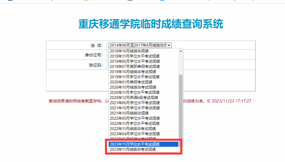 在“选项”中按需选择“2023年11月结换毕考试成绩”、“2023年11月学位水平考试成绩”,输入身份证号码(最后一位为“X”的需大写)和验证码,即可查询相应成绩。