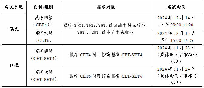 根据上级部门工作安排,结合我校实际情况,为做好我校2024年12月全国大学英语四六级考试报名工作,现将有关事项通知如下:
