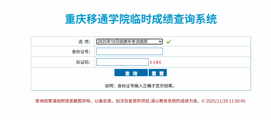 在“选项”中按需选择“2025年10月结换毕考试成绩”,输入身份证号码(最后一位为“X”的需大写)和验证码,即可查询相应成绩。【特别提醒:毕业论文(设计)、毕业实习成绩将完成后另行发布】。