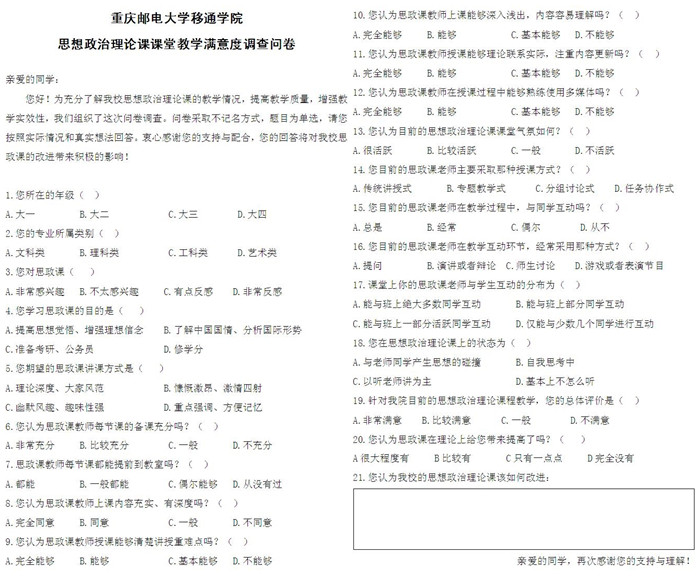 为准确把握我校思想政治理论课课堂教学的针对性和实效性,发现思想政治理论课教学过程中存在的问题,针对问题提出具体可行的解决措施,以提高我校思想政治理论课的教学质量,思政教学部在第12教学周面向全校思想政治理论课学生开展了思政课教学满意度调查。