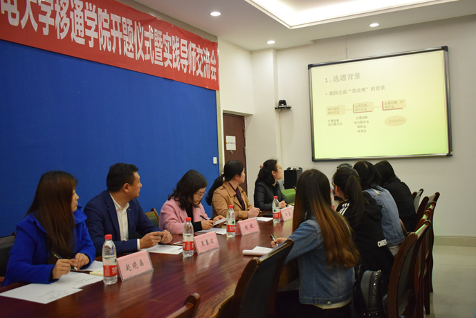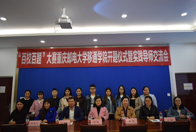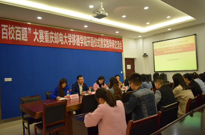 随着第一届“百校百题”应用型创新课题研究的进一步推进,我校参赛队伍已经通过资格审核阶段,经过企业导师匹配、大赛培训,现进入大区赛课题开题阶段。3月28日晚,在移通学院行政大楼417会议室举行了“百校百题”重庆邮电大学移通学院开题仪式暨实践导师交流会。教务处副处长刘枚、重庆巨能建设集团总承包公司总会计师王春波、课题组指导老师曾璐、赵晓晶和课题组全体同学参加此次会议。本次会议由工商管理系主任孙玺主持。
