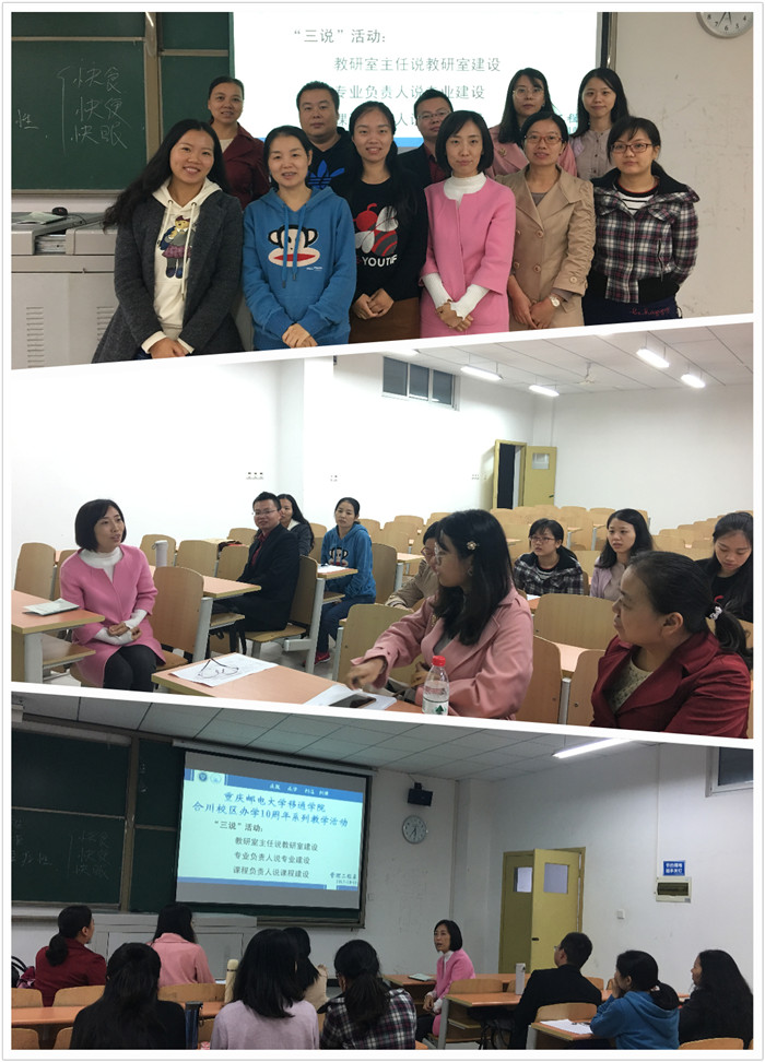 2017年10月11日下午,管理工程系开展了合川校区办学10周年系列教学活动——“三说”活动。本次研讨活动主要包括:①教研室主任说教研室建设;②专业负责人说专业建设;③课程负责人说课程建设。信管教研室和工程管理教研室分开进行,教研室全体教师都积极的为专业建设、教研室建设和课程建设出谋划策。