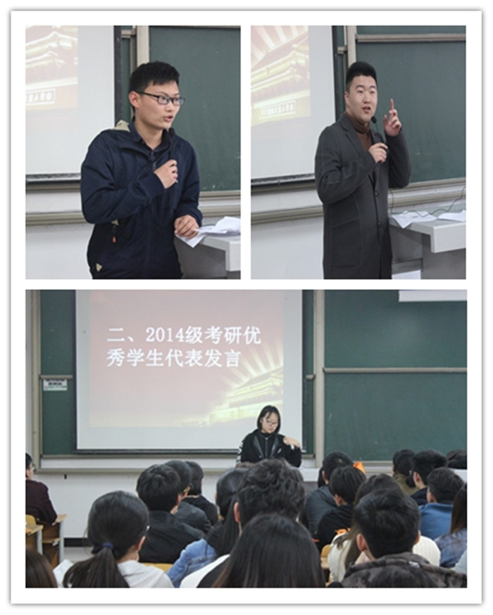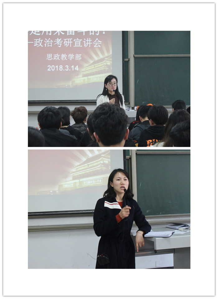 随后,思政教学部吴亚坤老师结合自身的考研经历,分别就如何立“研志”、交“研友”、读“研书”、创“研事”分享了自己的看法。吴老师表示:读研是储备知识,开阔眼界,是锤炼自己的一个过程,告诫同学们要珍惜在校生活,合理利用在校资源,努力打好考研攻坚战。杨贵珍老师也从为什么考研、如何准备考研、我院政治考研辅导班开设情况等几个方面与同学们作了分享,并鼓励同学们树立远大理想,坚定考研信心。