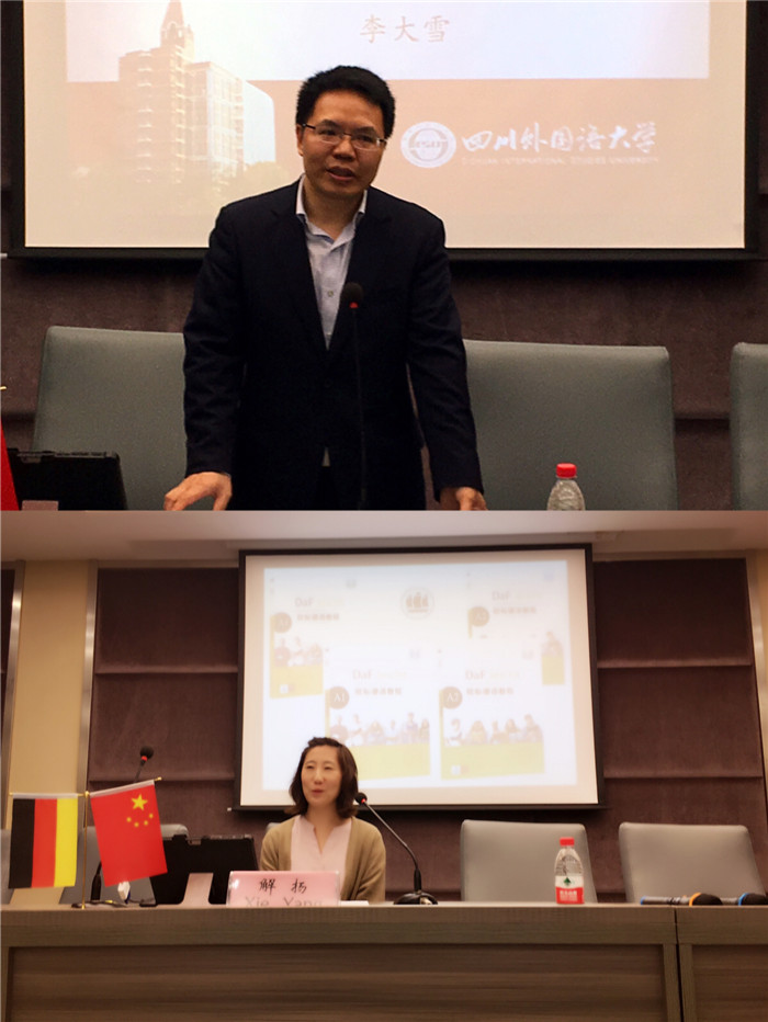 教材是课程的重要载体,也是完成教学要求的重要保证,为了进一步贯彻学院三位一体的教育理念,提高德语教师在教案撰写和教材编写方面的水平,提高教师对教材的理解能力和课堂把控力,3月30日下午四点,中德学院德语教研室特邀请了四川外国语大学德语系主任李大雪教授,译文出版社解扬编辑,外语系德语教研室主任熊光源老师,以及中德学院重点讲师谭劲秋老师,他们围绕德语教材的编写研究,课堂使用等方面为全体德语老师带了一场场内容充实的演讲,出席研讨会的还有中德学院尹浩亮院长,中德学院德语教研室主任侯宇晶老师和全体德语教师。