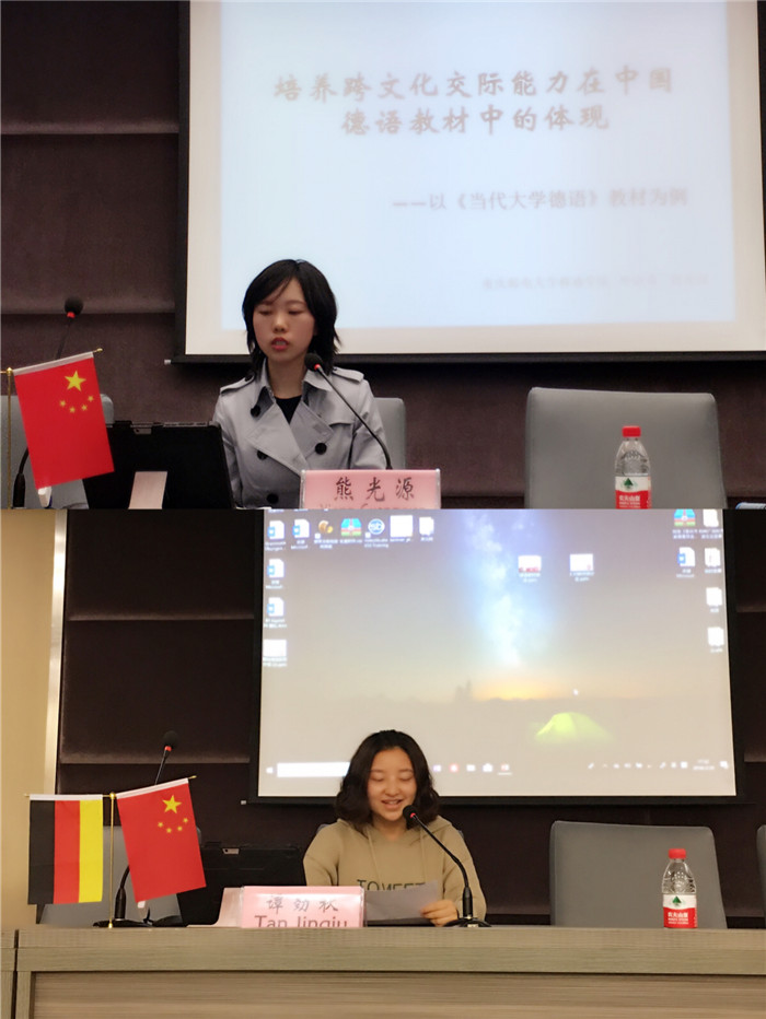 外语系的熊光源老师以德语专业的经典教材《当代大学德语》为例,详细分析了中国教材在培养学生跨文化交际能力的体现。她将评价教材培养跨文化能力分成了三个标准, 认知层面、情感层面和行为层面,并在三个层面设置不同的评价标准对教材的内容进行了详细的分析,并留给值得我们长期思考的问题“从学生,教师和教材的角度我们如何才能更好地培养学生跨文化交际的能力?”。中德学院的谭劲秋老师分享了自己长期在德语教学一线中对于教材使用的一些心得和经验,她简单的比较了德语专业高校和德语培训使用教材,并以中德学院为例,结合自身的教学经验,分析了从教以来对于不同德语教材的使用过心得,如《新求精》系列,《走遍德国》,《交际德语》以及目前正在使用的《柏林广场》和《欧标德语教程》,她指出,与德语专业不同,我们培养的学生除了德语学习之外还有专业课程的学习,因此我们应该以欧洲语言标准为参照,着重培养他们听说能力,这样有助于他们出国之后更好地适应和融入德国的学习生活。