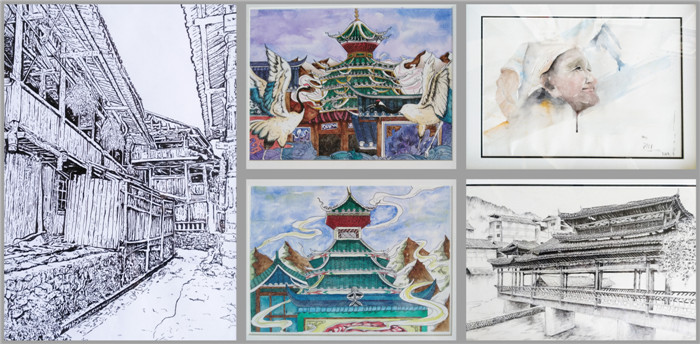 本次展览共展出70余幅优秀作品,结合风景色彩、速写、蜡染等多种形式,描绘苗族以及侗族民居建筑风格、生活小景和自然风光,表现黔东南人文与自然风光完美结合的独特意蕴。作品风格迥异、生动形象,或娟秀工整,透露古韵之风;或大胆豪放,体现苍劲之气;或色彩淡雅,流露古巷静谧;或浓郁之彩,彰显村落热闹。林荫小道、古朴建筑、潺潺流水尽显其中,每一幅作品都蕴含着浓浓的人文气息。写生展现场人流涌动,影展、画展相得益彰,形成了一道独特别样的风景线,吸引了诸多师生的目光。