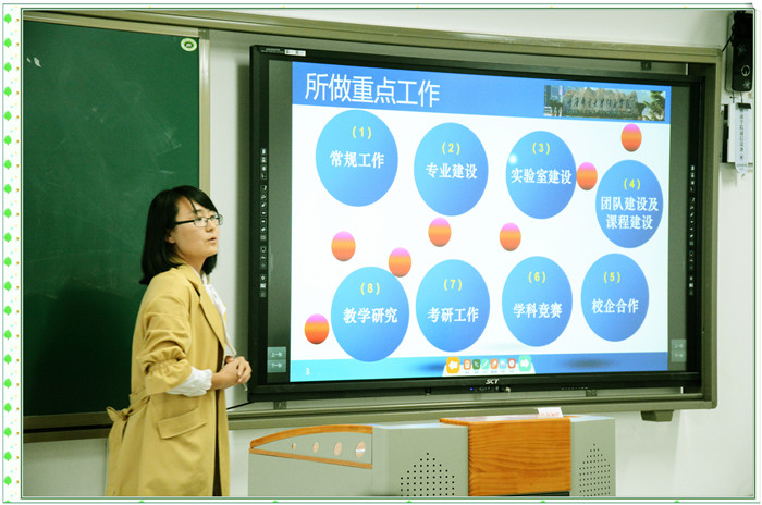 党晓圆副院长从常规工作、专业建设、实验室建设、师资队伍建设及课程建设、校企合作、学科竞赛、考研工作和教学研究等八个方面对上学年工作做了详细总结。党晓圆副院长讲到:教师是教育工作的组织者、领导者,学院的发展离不开全体教师的辛勤付出和无私奉献,2017-2018学年智能工程学院在汪纪锋教授的带领下,在大家团结协作,共同努力下,取得了骄人的成绩。上学年我院积极落实学校四项育人机制;积极认真完成“电气工程及其自动化”专业的ASIIN认证自评报告和附件材料;顺利开展“轨道交通信号与控制”专业实验室建设方案专家论证会;采用外引内培方式,引进冯铁成等7位新进教师,内部培养崔卫星等2位双师素质教师;组建“电力智能控制基础”教学团队,开展课程建设;与重庆大江动力设备制造有限公司进行校企合作洽谈,40余名2018届毕业生毕业设计在校企合作单位“真题真做”;与重庆红亿机械有限公司工程师研讨“智能制造工程师班”课程建设;2018“西门子杯”中国智能制造挑战赛,第四届中国“互联网+”大学生创新创业大赛,十三届届全国大学生“恩智浦杯”智能汽车竞赛,“合泰杯”第十一届重庆大学生单片机应用设计大赛,2018年TI杯重庆市大学生电子设计竞赛捷报不断,再创佳绩;考研工作成绩喜人,11名同学成功考取研究生;教学研究方面,成功立项校级教改项目3项,重庆市教委教改项目1项,重庆市教委科学技术研究项目青年项目3项,结题各类项目5项。