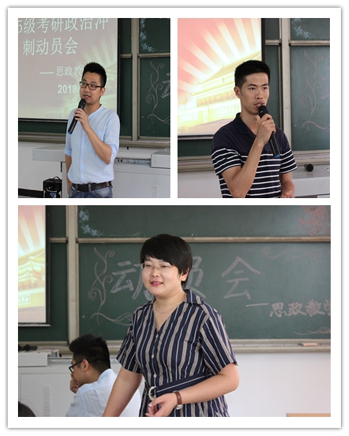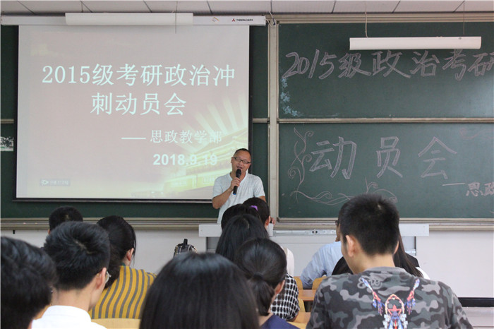 为帮助我校学生学习考研技巧,增强考研信心,提升考研竞争力。9月19日下午16:00,思政教学部在4205教室举行了2015级考研政治冲刺动员会。动员会由政治理论教研室教学团队带头人邹建平老师主持,德育教研室主任杨勇老师、政治理论教研室主任李阳老师携考研课程任课教师参加了此次大会,与部分考研学生分享了他们的宝贵经验。