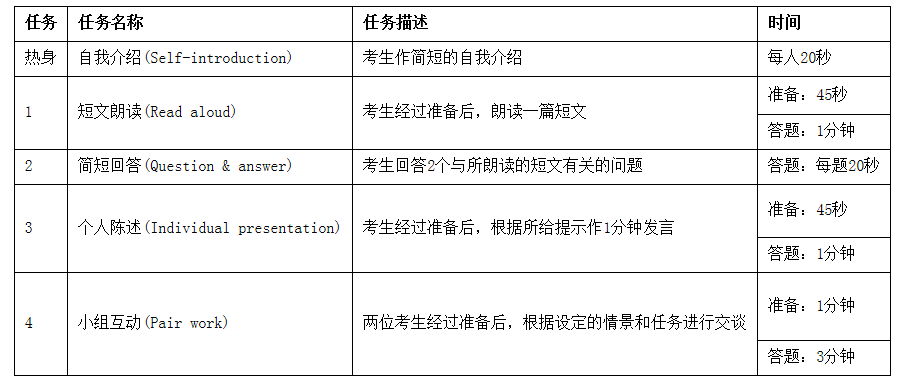 大学英语口语考试(CET Spoken English Test),简称CET—SET,是用于测试我国大学生运用英语进行口语交际的能力的考试。如今,英语四、六级考试已经成为求职、毕业的的“必修”考试科目,随着考试制度的进一步完善,全国大学英语四、六级考试委员会又推出了大学英语口语考试—SET,将口语纳入到CET考试大纲,口语考试成绩加入CET成绩单,CET已成为听、说、读、写、译一体化的英语考核体系。当前,我市正部署全面开展大学英语四、六级口语考试。以大学英语四级考试为例,目前的口语考试任务设置分为以下几个环节(参见下表):