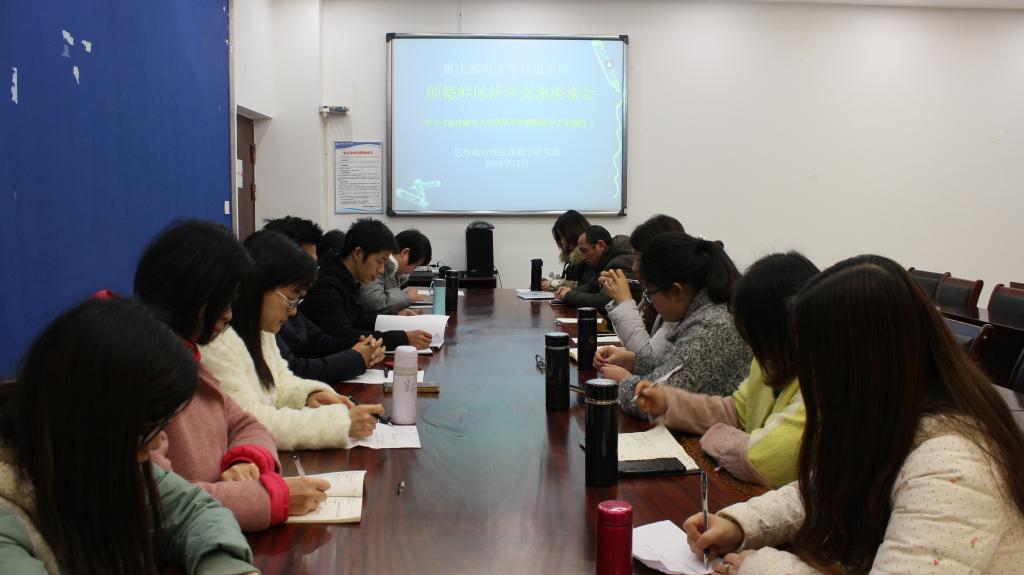 教育发展,教师为本;教师素质,师德为首。为进一步加强师德师风建设,规范教师教育教学行为。12月26日下午,思政教学部在417会议室举行师德师风学习座谈会。会议由德育教研室主任杨勇老师主持,思政教学部全体教师参加。此次会议根据《重庆邮电大学移通学院教师教学工作规范》为指导,围绕“潜心教书育人,加强师德师风”为主题展开。