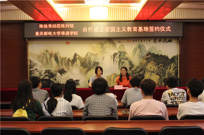 为深入贯彻落实习近平总书记在纪念五四运动100周年大会上重要讲话精神,深切缅怀五四先驱崇高的爱国情怀和革命精神,激发新时代大学生用实际行动践行“爱国、进步、民主、科学”的五四精神,同时进一步拓展我校思政课教学实践育人平台,6月2日,我校与重庆市江津区陈独秀旧居陈列馆合作成立爱国主义实践教育基地签约及授牌仪式,在重庆市江津区陈独秀旧居陈列馆会议室举行。陈独秀旧居陈列馆馆长赵永芳携部分员工代表与我校思政教学部邓燕主任,思政教学部杨勇、陈静、姚黎华以及廊桥书院滕壬鑫等老师和我校学生代表共同出席了会议。