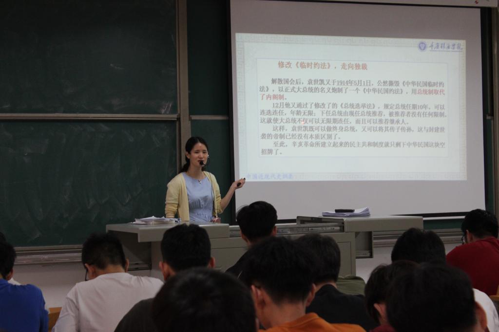 此次公开课由政治理论教研室的吴雪娇老师讲授《中国近现代史纲要》第三章第三节—辛亥革命的失败。教学过程中,吴老师回顾了辛亥革命的过程,通过场景模拟的方式让同学们置身于民国,思考辛亥革命失败的原因及中国未来的道路在何方。教学模式上,吴老师通过播放视频、分析图片、对比数据等方式,引导同学们自主思考、学习。作为一名新进教师,吴老师基本功扎实、逻辑清晰、内容详实,较好地完成了本次教学任务。