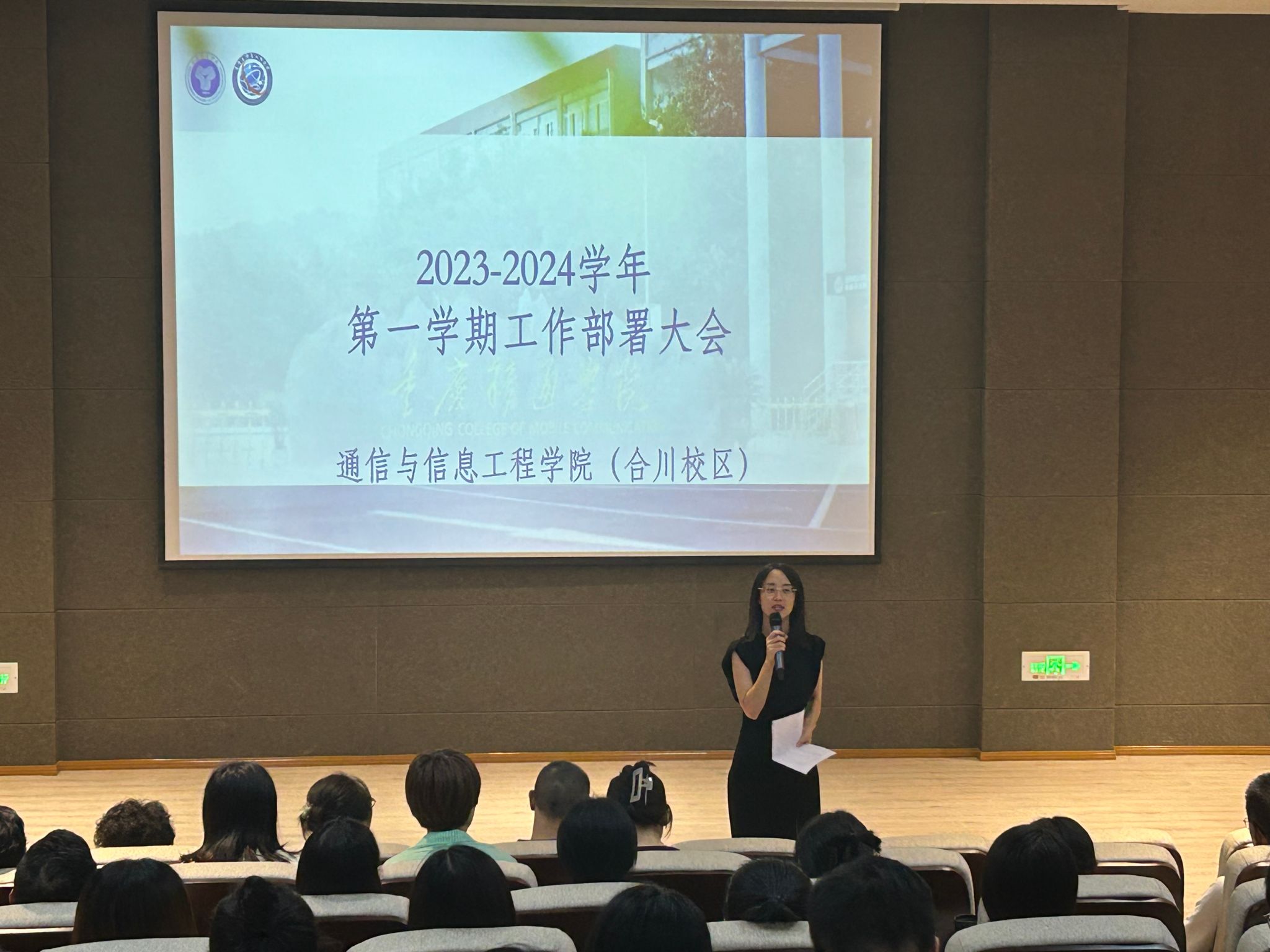 为进一步凝聚共识,推动学院新学期各项工作开好头、起好步,9月6日下午,通信与信息工程学院在六度空间的无限多功能厅召开了2023-2024学年第一学期工作部署大会。此次会议由通信与信息工程学院院长李文娟主持,学院全体教师和辅导员参加。