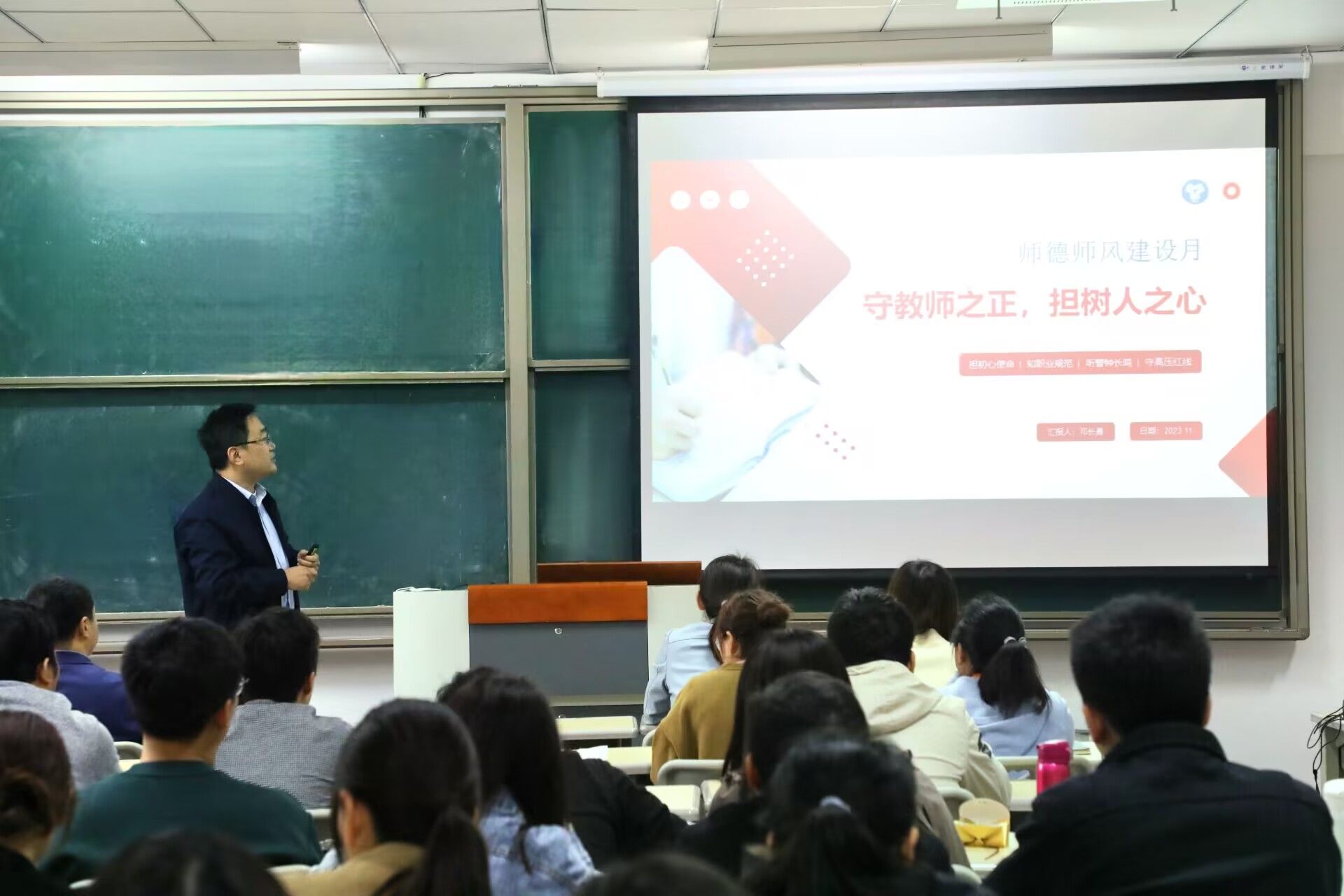 学是师之骨,德为师之魂。高尚的师德,是对学生最生动、最具体、最深远的教育。为进一步贯彻党的教育方针,推进师德师风建设活动的深入开展,加强学院师德师风建设,弘扬新时代高校教师道德风尚,智能工程学院于11月8日下午2点,在9204举办师德师风专题学习大会,学院全体教职工参加了会议。会议由党晓圆院长主持。