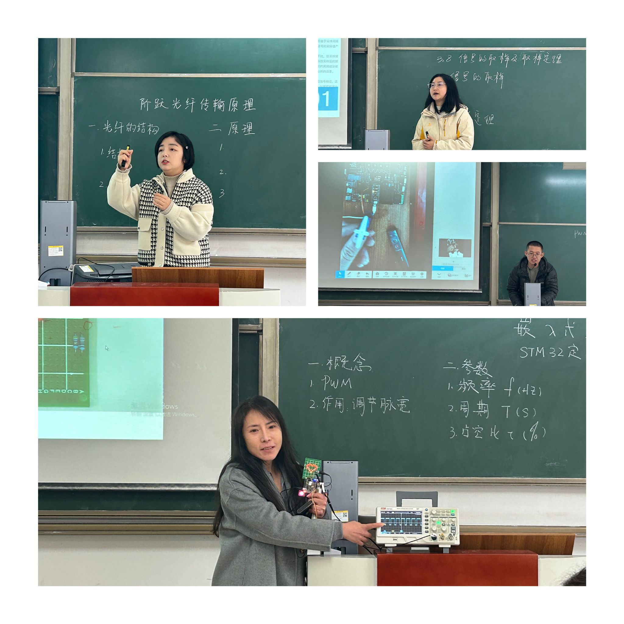 随后的比赛环节中,八位青年教师分别从说课和教学内容两个方面展示了各自的教学方法和专业特长。李曼老师以两种常见光纤对比演示的方法引出赛课的教学内容《阶跃光纤传输原理》,她用平和的声音和细致入微的讲解方式介绍阶跃光纤的结构和传输原理,并将知识点有条理的板书出来。吴萍老师以“为什么?是什么?做什么”这一系列问题展开自己的赛课内容《信号的取样及取样定理》,她通过清晰的逻辑结构和详细的讲解,将知识点层层递进地呈现出来,同时采用多教学软件相结合方式,激发学生们的学习兴趣和求知欲。林振善老师的比赛内容是《PWM-脉冲宽度调制》,他运用游戏的方式将抽象的知识变得具体生动,通过舵机转动引出PWM的概念以及波形产生的原理,整个教学过程充满了趣味和惊喜。董妮娅老师用温柔的声音和亲切的表情以互动的方式讲解自己的教学内容《STM32定时器产生PWM》,营造了一个和谐的学习氛围,内容表现生动有趣,PPT制作精美,最后以Practice仿真调节呼吸灯亮度来结束自己的讲课。