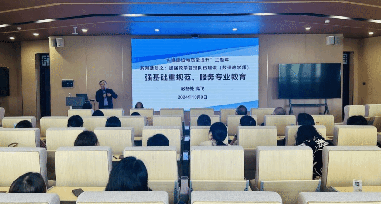 10月9日下午,数理教学部成功举办了“内涵建设与质量提升”主题年系列活动。本次活动有幸邀请到教务处高飞处长作为主讲嘉宾,主题为“强基础重规范、服务专业教育”。数理教学部全体教师到场聆听了讲座,讲座由数理教学部主任杨春德教授主持。