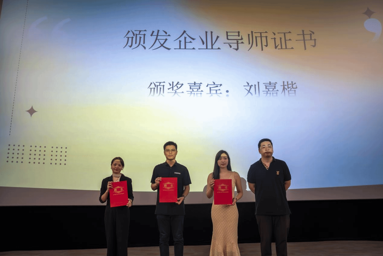 随后,数字媒体产业学院主管刘嘉楷为罗绫、刘杨靖等企业导师颁发聘书,感谢他们为实训班带来行业的经验与资源。企业导师代表罗绫结合自身短视频行业经验,为学员们分享了实用的实践要点;刘杨靖则聚焦数字乡村领域,通过案例让学员们对未来的学习方向有了更清晰的认知。作为企业代表压轴发言的是奇妙村(重庆)农业有限公司董事长、重庆市綦江区足球协会会长彭纯亮。他从产业实践角度出发,阐述了数字媒体在农产品品牌打造、乡村旅游推广中的应用前景,让学员们深刻感受到所学知识的实践价值。随后全体参会人员合影留念,定格下这一充满希望的瞬间。