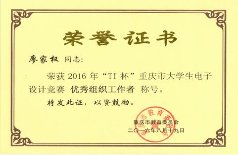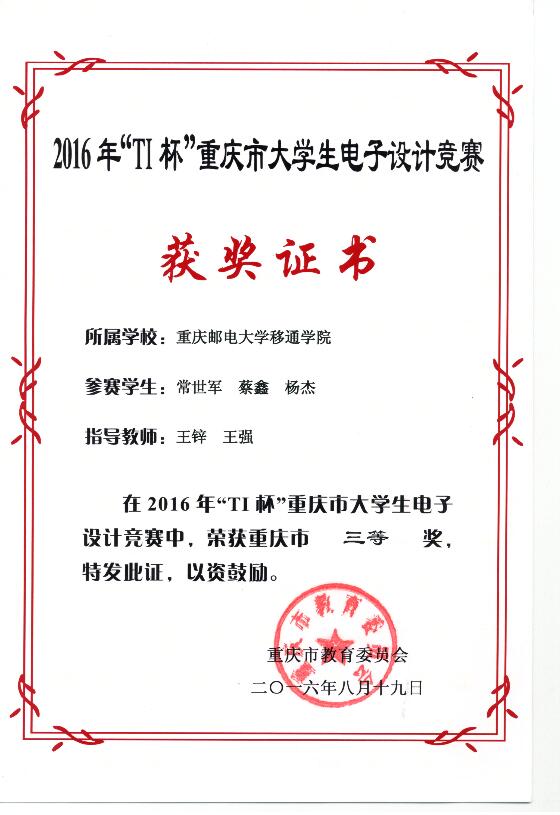 2016年“TI杯”重庆市大学生电子设计竞赛已圆满结束。我校通信与信息工程系和远景学院共组织了14支参赛队伍。其中,通信与信息工程系学生常世军、蔡鑫和杨杰在实训中心教师王锌和通信与信息工程系教师王强的指导下荣获三等奖,其余13支参赛队获得成功参赛奖,教务处廖家权老师获得优秀组织工作者。